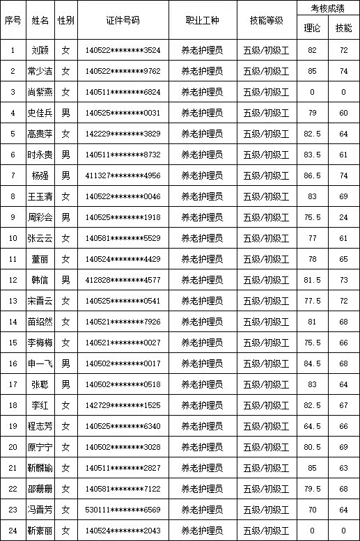 山西潔霸清潔服務(wù)集團(tuán)股份有限公司職業(yè)技能等級認(rèn)定中心2025年11月2日第1批養(yǎng)老護(hù)理員初級認(rèn)定人員成績公示